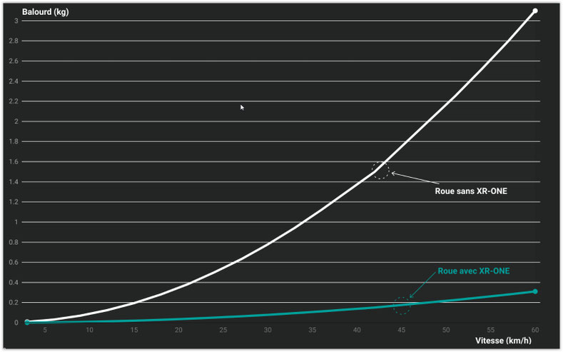 Dans le milieu de la roue de vélo, le balourd est principalement influencé par la valve de gonflage qui engendre un surplus de masse en un point. Ce surplus de masse peut atteindre jusqu’à 20g pour les roues les plus déséquilibrées. Au-delà de la valve, les roues de vélo possèdent également une répartition de matière qui peut être hétérogène et variable autour du rotor (jante, pneumatique, chambre à air). C’est pourquoi, le dispositif XR-ONE est capable de gommer ces imperfections pour établir un équilibrage de précision au gramme près.